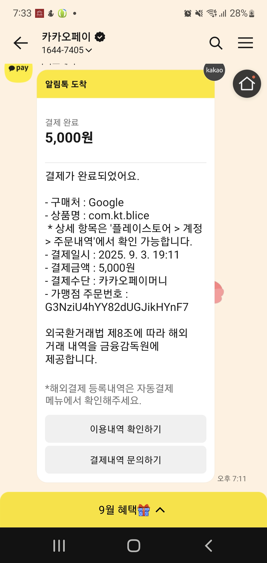 3대500 대장장이 2025-09-03 19:39:39 결제완료라고 하는데 오류가 나서.. 취소되었다고 하는데.. 카카오 페이에서는 결제된것으로 나오고.. 블라이스에서는 5,000캐쉬가 없어서요 어떻게 된걸까요