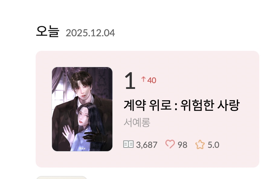 서예롱 2025-12-05 22:39:59 감사합니다! 몇개월 전 쓰고 있던 세명의왕녀 이후 오랜만에 1위를 하네요:) 계속해서 열심히 연재하겠습니다:)
