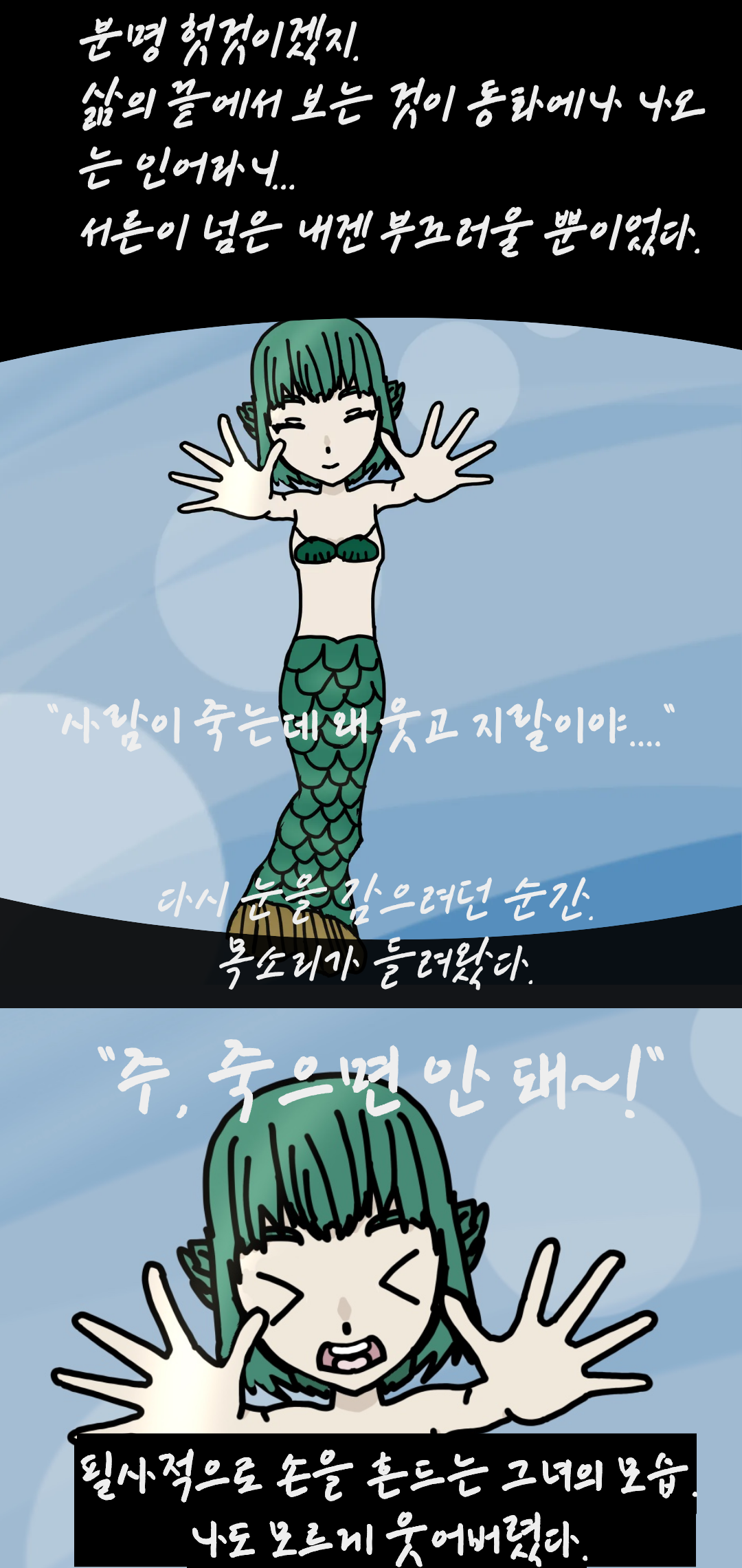 • 군무원준비생 2025-12-17 12:29:15 죽지 말라고 바둥거리는 인어가 너무 귀엽네요 ㅋㅋㅋ 건필하세요! 0