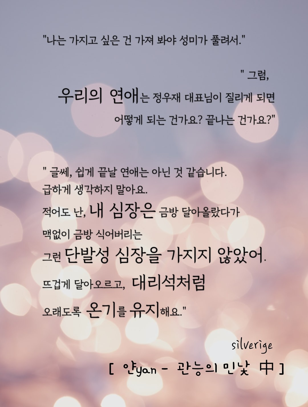 이제 조금씩 이 남자에게로 마음을 여는 리윤씨. 외로웠을 이 여자에게 우재 씨가 안식이 되어주길 바랍니다.