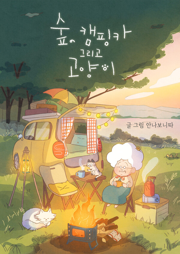 덜덜거리는 차를 끌고 무지개색 꼬리를 가지고 있는 귀여운 고양이와 함께 캠핑을 온 할머니...