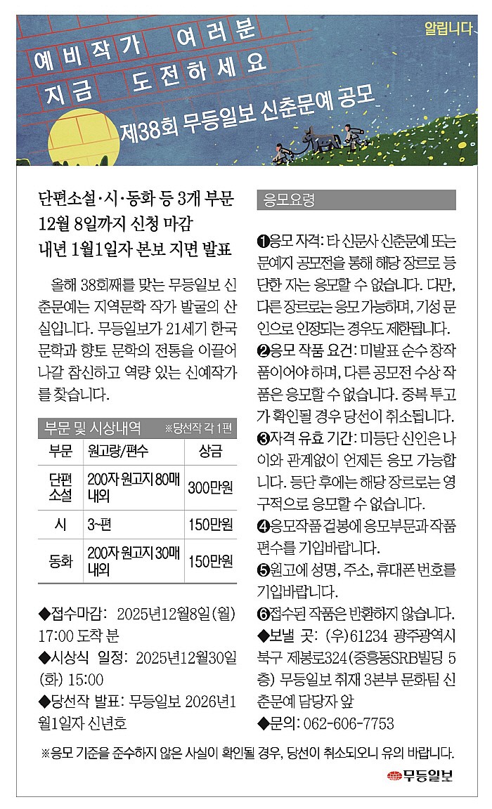 * 보낼 곳: (우)61234 광주광역시 북구 제봉로324(중흥동SRB빌딩 5층) 무등일보 취재 3본부 문화팀 신춘문예 담당자 앞
