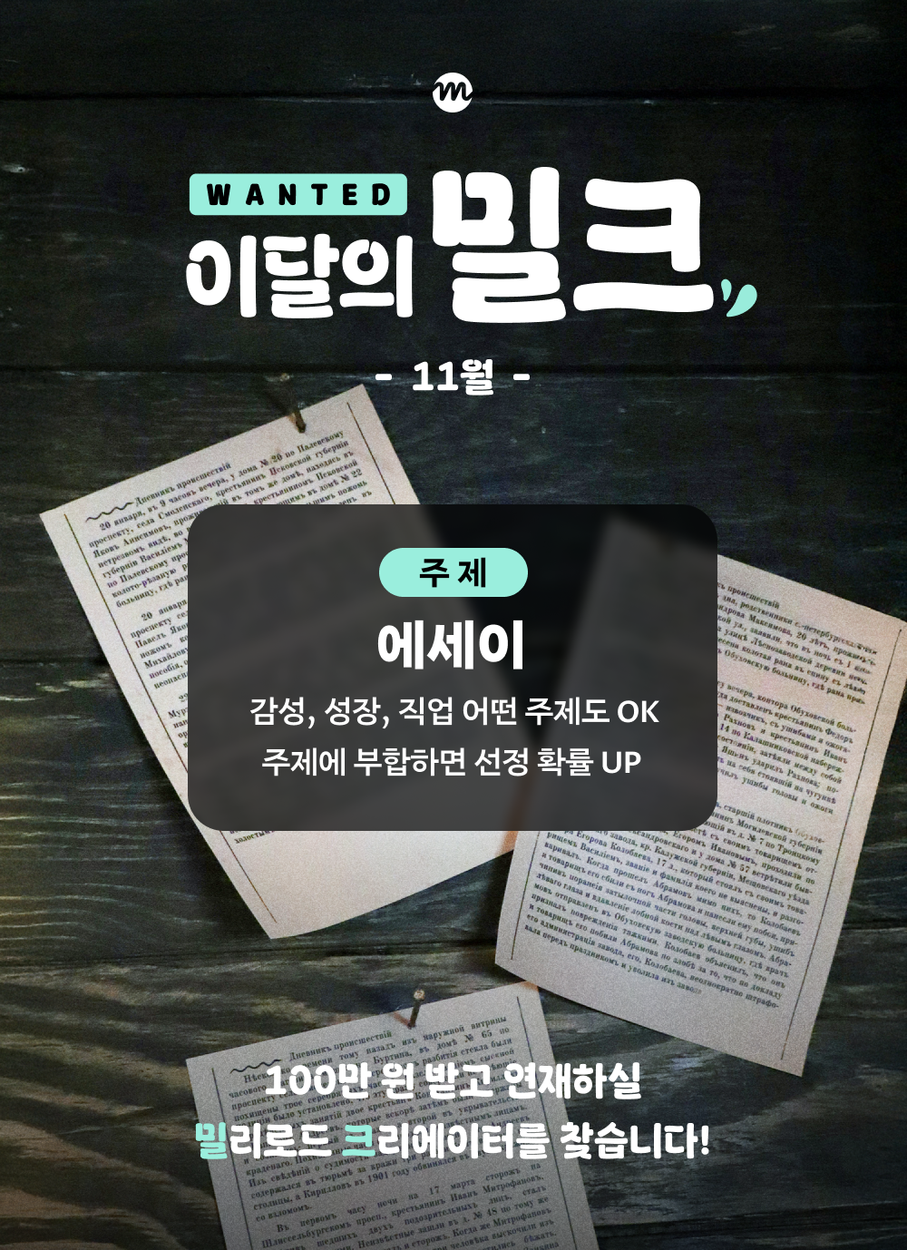 - 5명 : 각 100만 원 (이달의 밀크 필수 활동 진행 시 창작 지원금 지급)