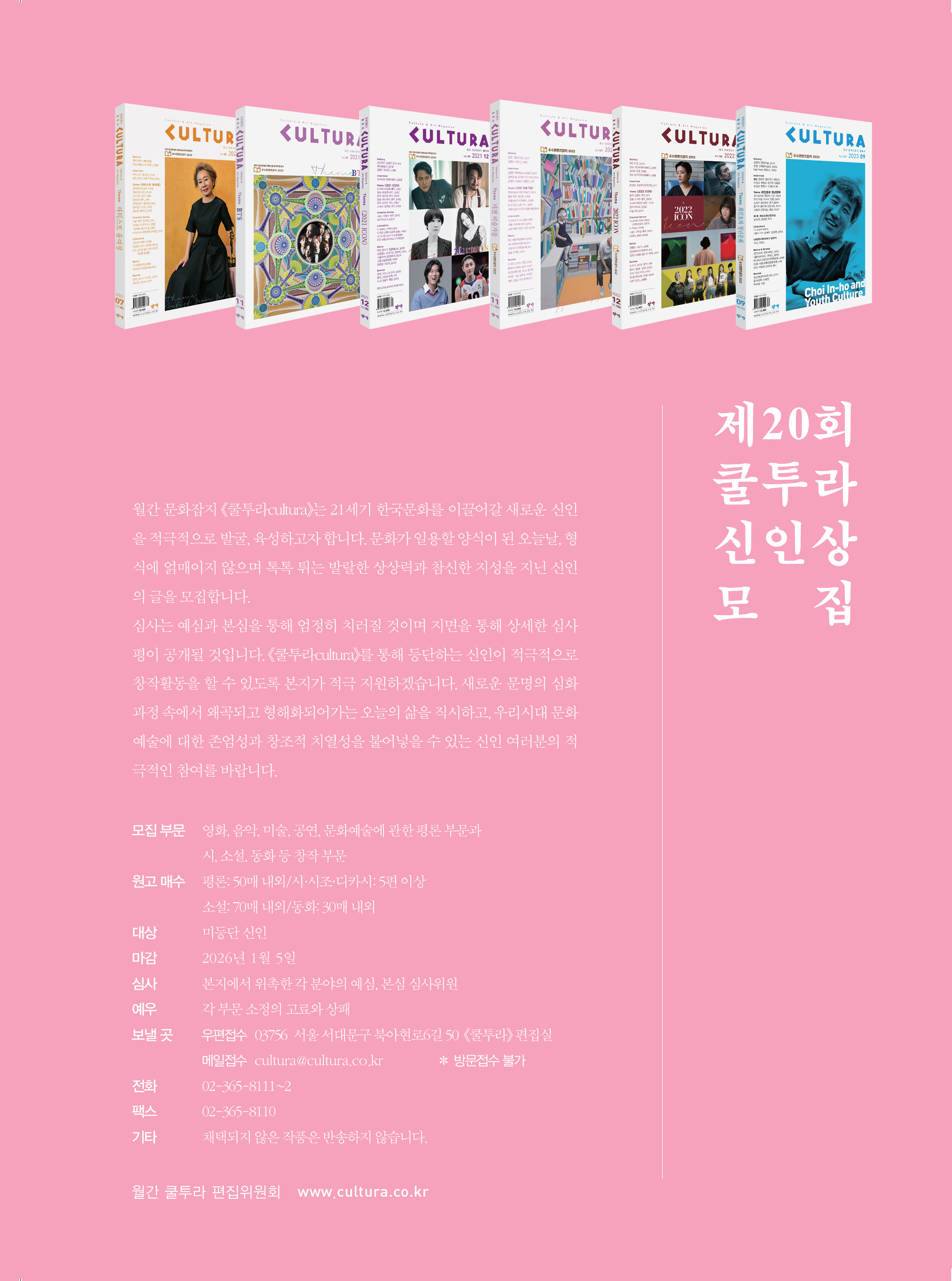 월간 문화잡지 《쿨투라cultura》는 21세기 한국문화를 이끌어갈 새로운 신인을 적극적으로 발굴, 육성하고자 합니다. 문화가 일용할 양식이 된 오늘날, 형식에 얽매이지 않으며 톡톡 튀는 발랄한 상상력과 참신한 지성을 지닌 신인의 글을 모집합니다.