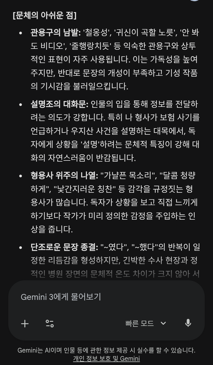 구석괴물 2026-02-25 15:08:12 설날 때문에 개 망했지만, (알바 때문에 시간도 없고, 집중도 안되서) 이번주는 업로드할 계획인데.... 쉽지 않네요 ㅠㅠ 그래도 이미 한 회차는 끝냈는데 갑자기 순서를 바꾸는 게 더 낮겠다는 생각이 들어서 현재 쓰고 있는 회차를 앞 순서로 올리려니 업로드 날이 계속 미뤄지고 있는 중 ㅠㅠ입니다. 허리 아파서 잠깐 누웠네요. 시간이 참, 빠르다는 생각 뿐. 아침부터 3화 조금이지만 수정했음요. ai 분석 지적에 긁혀서 지랄발광도 했지만 끝내 수긍하고 수정했어요. 수정하고도 여전히 아쉽다고는 하는데 뭐, 제 글재주가 똥인걸 어쩌겠습니까.. 에휴~ 설명조 문체를 고쳐야 되는데 쉽지 않네요. 쓸때마다 신경쓴다고 쓰는데도... 에휴, 재능이 없구나 오늘도 또 깨달았던 날입니다. 그래도 계속 연습하고 노력하다보면 조금은 나아지겠죠... 다시 수정할 예정입니다. 지금은 지쳐서 지적한 부분의 설명조 형식을 어떻게 고쳐야 될지 머리가 안돌아가는 상태라 ㅠㅠ 일단 쓰던 4,5화 부터 끝내 놓고 다시 천천히 들여다보고 고민해 봐야 될 것 같아요. 오늘도 모두들 파이팅! 입니다.